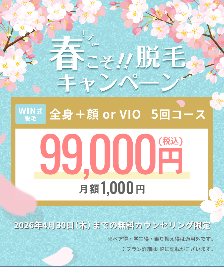 施設名 ウィンクリニック 診療時間 11:00〜20:00(平日) 11:00〜20:00(土日祝) 住所 【大阪院】 〒530-0051 大阪府大阪市北区太融寺町8-2 エーワンビル 5階 【三宮院】 〒651-0094 兵庫県神戸市中央区琴ノ緒町5-2-3 協律三宮センタービル6階 【西梅田院】 〒530-0001 大阪府大阪市北区梅田2-4-37 西梅田上島ビル4階 日曜祝日は出入口が以下に変更になっております。4階までお越しください。 大阪府大阪市北区梅田2-4-40 桜橋上島ビル 【天王寺院】 〒545-0052 大阪府大阪市阿倍野区阿倍野筋1丁目5-31 アポロビル5階 【心斎橋提携院】 〒542-0086 大阪市中央区西心斎橋1-13-15 三栄心斎橋ビル6F HP https://win-clinic.jp MAIL winclinic.umeda@gmail.com winclinic.sannomiya@gmail.com winclinic.nishiumeda@gmail.com maclinicstaff@gmail.com winclinic.tennouji@gmail.com ※99,000円プランにはワキの施術は含まれません。